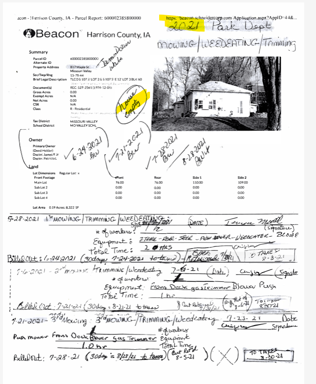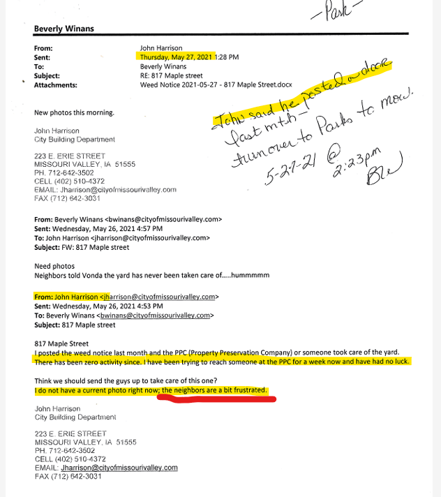 The first abatement notice issued by John Harrison was on May 27, 2021, and the form itself notes “HOUSE EMPTY.” At that point, the neighbor had already been notifying the city for at least two years about the property’s abandoned and deteriorating state. In that same report, Harrison stated he had posted a notice on the door and that there had been “zero activity since the last notice a month ago,” acknowledging that the neighbors were “a bit frustrated.” Photos from that date show the posted notices on the window.