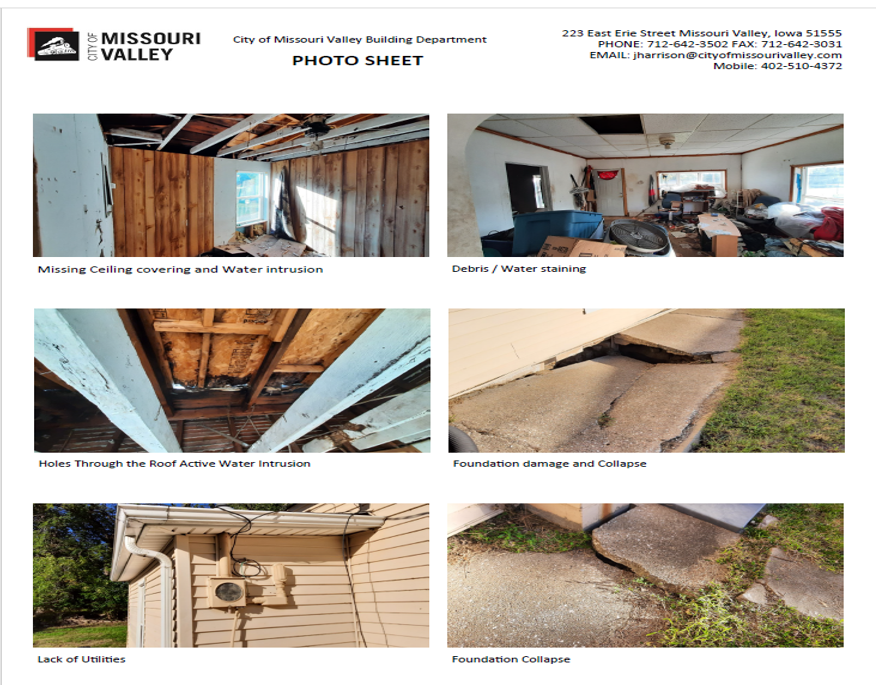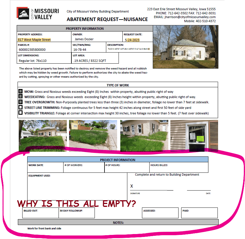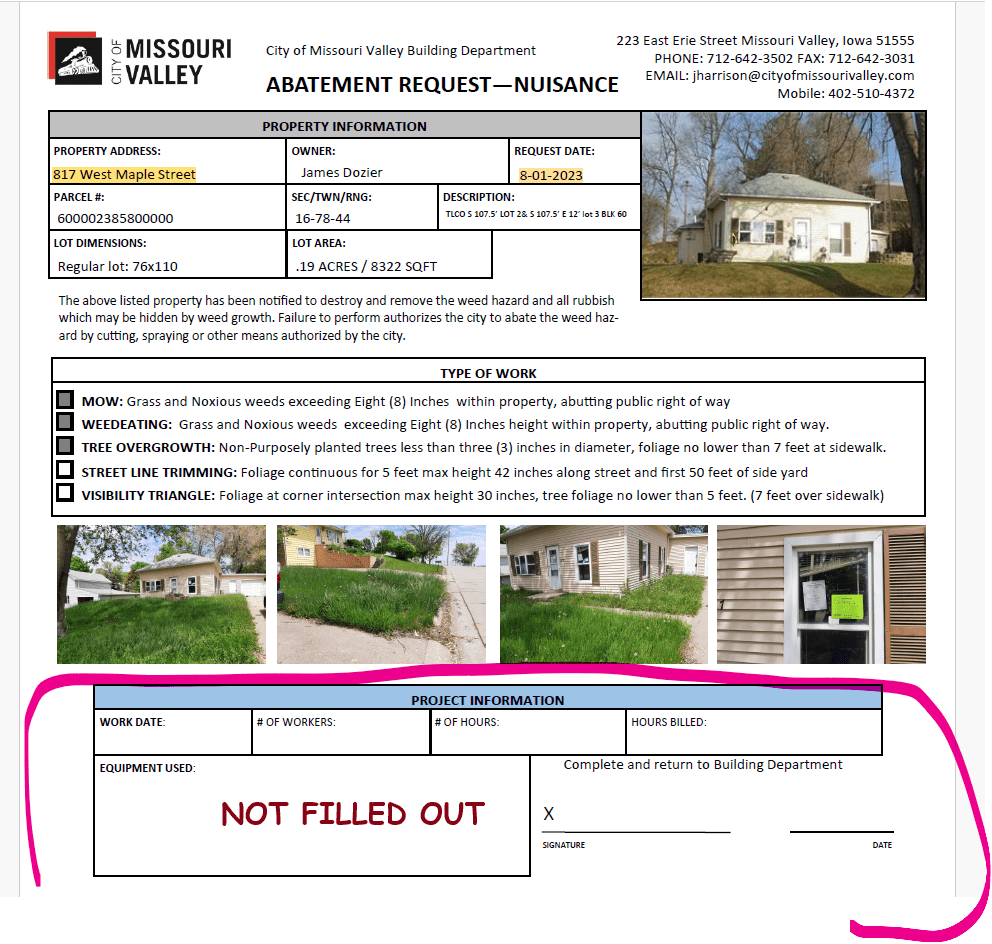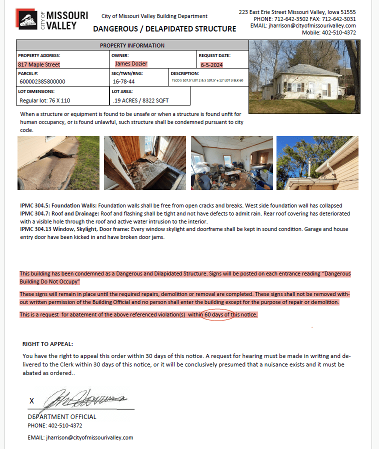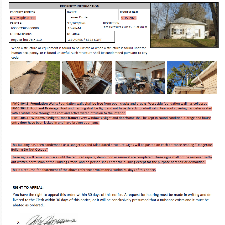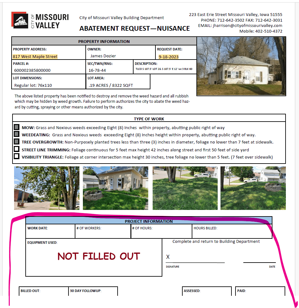 After this initial notice, no further abatement action occurred for nearly two years. The next documentation appears on May 24, 2023, August 1, 2023, and September 18, 2023, and all three only cite weed violations — not structural decay or public safety hazards. These forms weren’t even filled out completely with the city’s identifying information. Then, on September 15, 2023, the home was condemned as dangerous and dilapidated, with a 60-day notice for abatement. There is no record of any follow-up inspection or enforcement after that deadline expired.