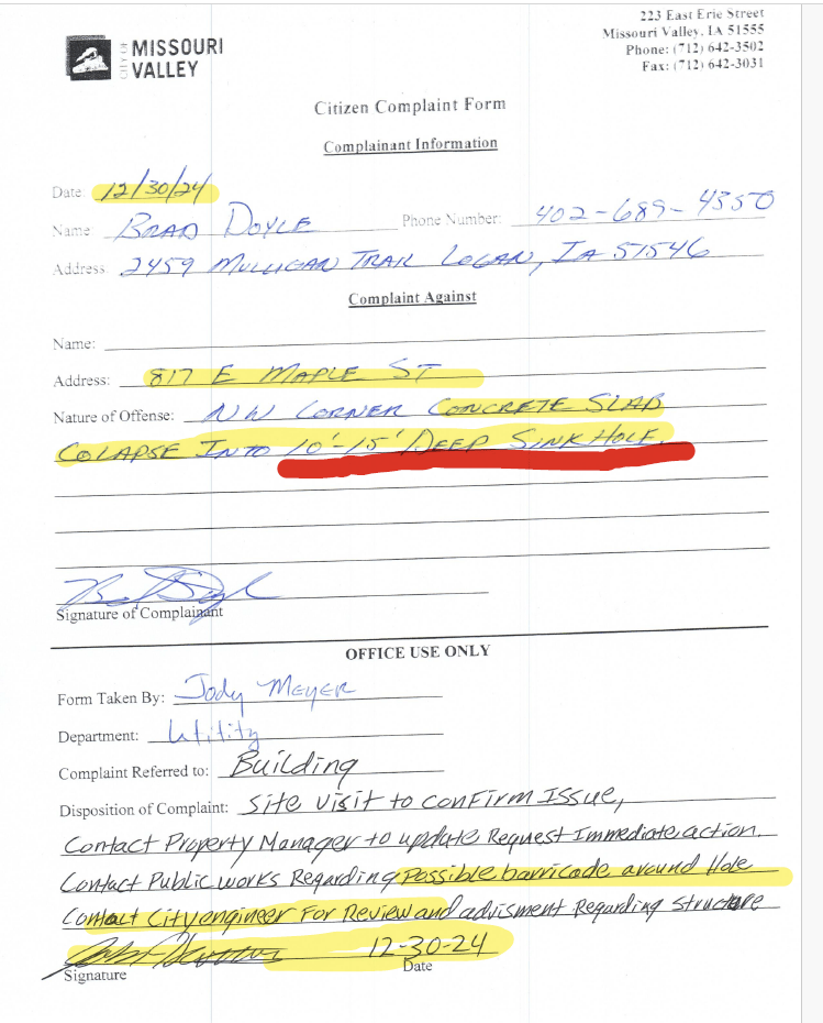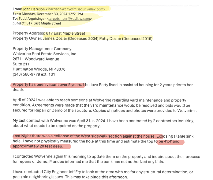 This prolonged inaction allowed the property to deteriorate to the point that, on December 30, 2024, a 20-foot sinkhole appeared overnight. The elderly neighbor was awakened by her house shaking, believing it was collapsing. Her family submitted a written complaint to City Hall on her behalf that same day. On that date, Harrison emailed City Attorney Todd Argotsinger, acknowledging both the sinkhole and that the house had been vacant for over five years. This property sits directly across from the school, making the city’s inaction especially alarming.