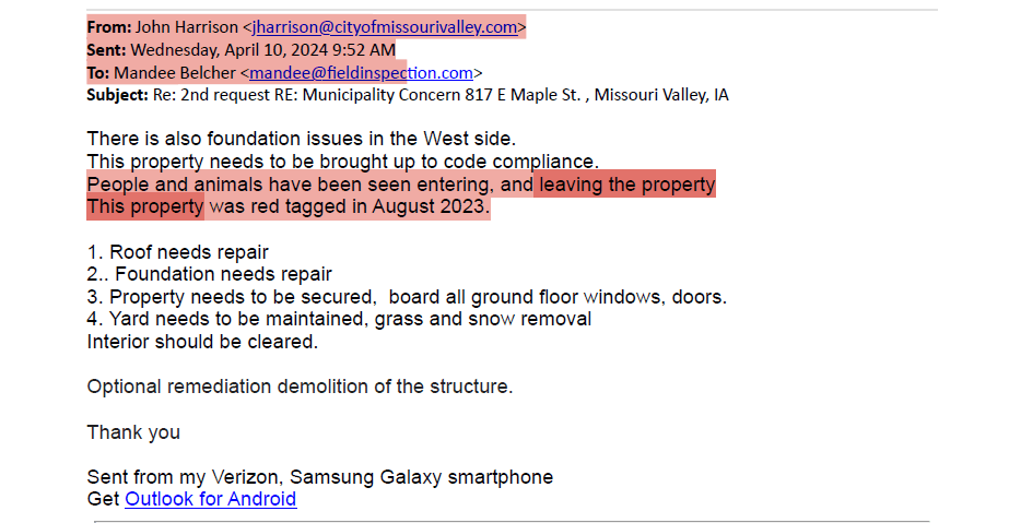 On April 10, 2024, seven months later — and three years after Harrison first documented the house as empty — he sent an email acknowledging that people and animals were entering and leaving the property, noting it had been red-tagged since August 2023. The property was condemned again on June 5, 2024.